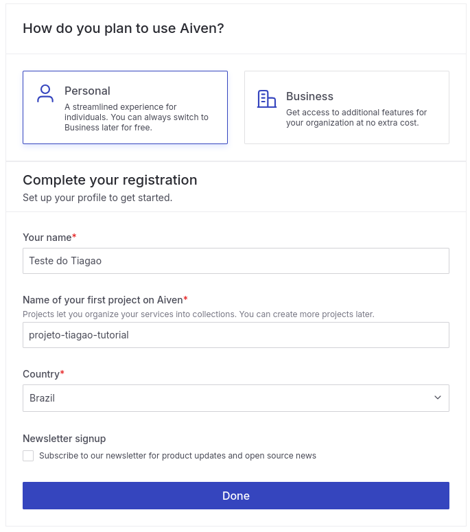Acesse o site oficial do Aiven e crie sua conta (https://console.aiven.io/signup) ou faça login com seu GitHub.