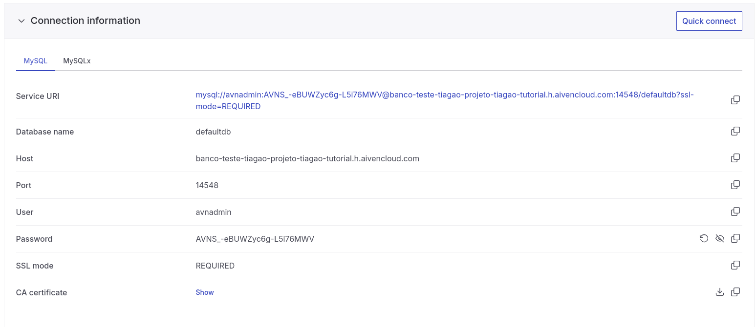 No painel de visão geral do seu banco de dados no Aiven, você terá todas as informações necessárias para conectar ao banco, como na imagem abaixo.