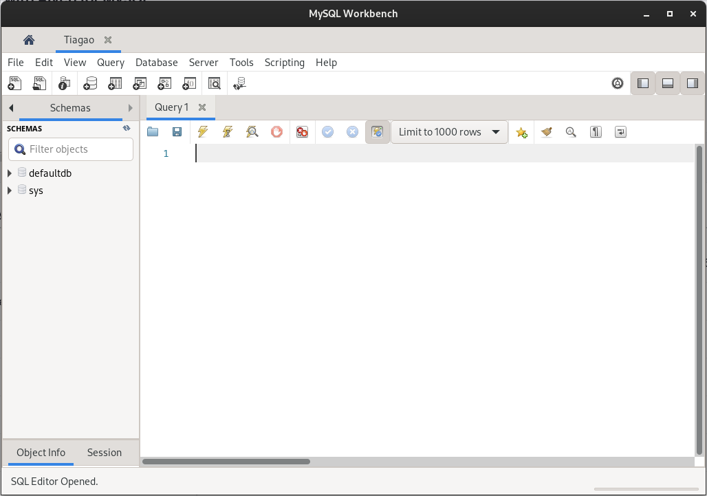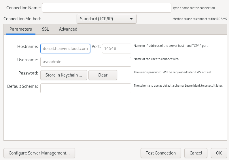 AVISO: O Workbench provavelmente pedirá uma senha para você; essa senha está na aba de visão geral do seu banco de dados. Também pode ser encontrada na aba Users do Aiven.