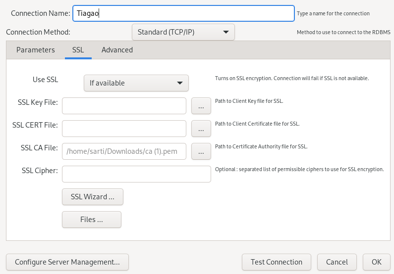 Após preencher os campos, baixe o CA certificate no site do Aiven (veja o Quick Connect se precisar de ajuda) e faça o upload do CA certificate na aba SSL.
