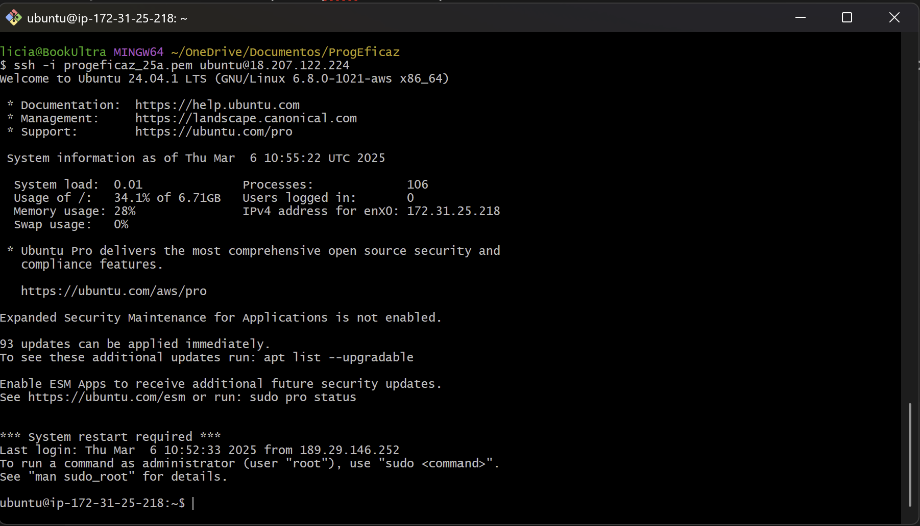 Depois, abra um terminal git bash para acessar a máquina na AWS via SSH com sua chave pem e IP público: