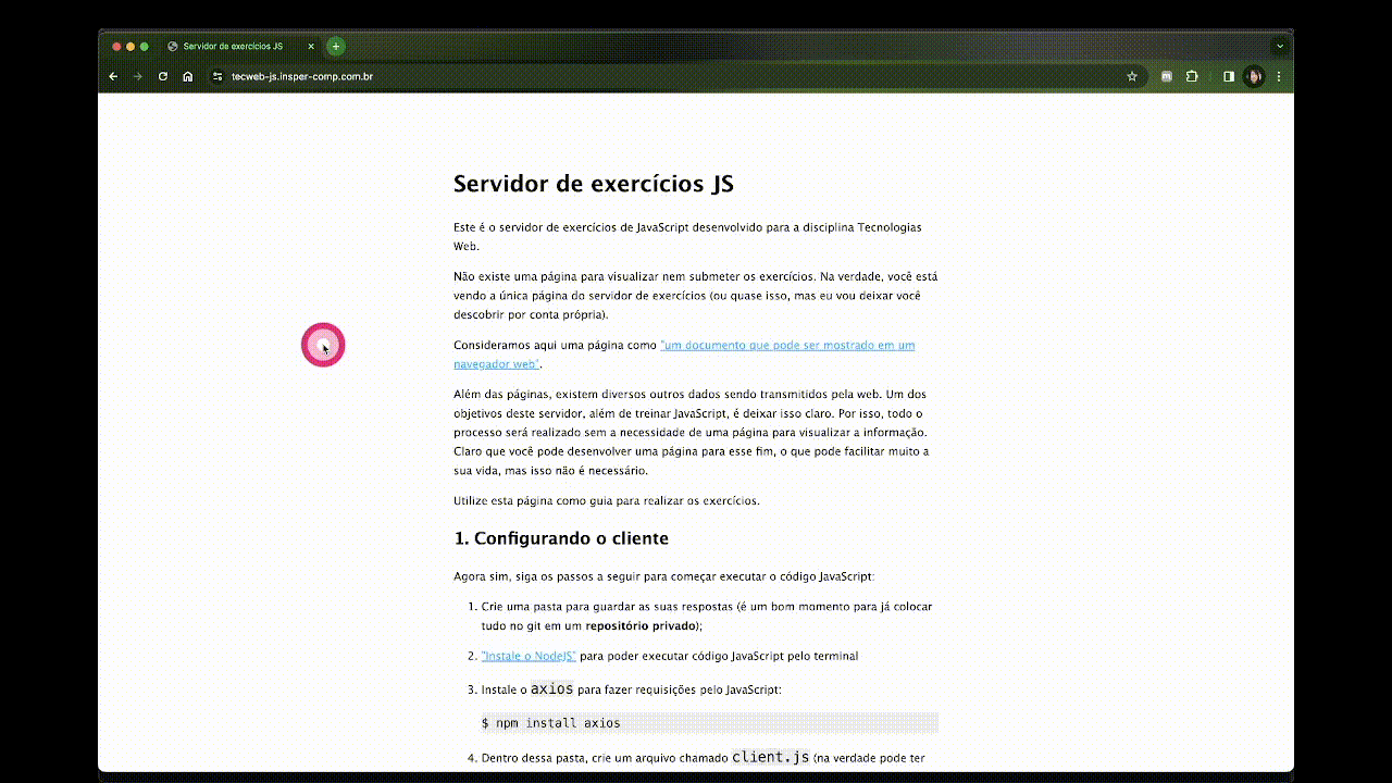 Existem diversos tutoriais/vídeos/posts muito mais completos sobre JavaScript disponíveis na internet. O objetivo deste handout é oferecer uma breve introdução ao JavaScript para aqueles que não estiverem familiarizados com a linguagem. É esperado que você seja capaz de se aprofundar na linguagem por conta própria a partir deste ponto. Para isso, disponibilizamos o servidor de exercícios JS para você praticar. Importante: os exercícios do servidor são considerados como atividade de aula e devem ser entregues até a data estipulada aqui.