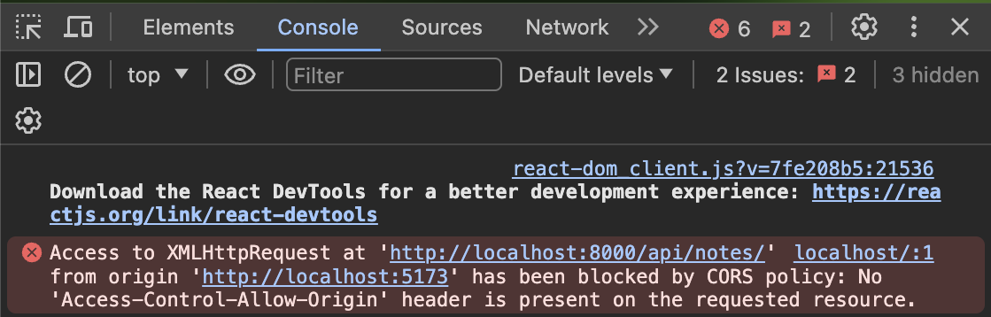 Esse erro ocorre porque o navegador está tentando te proteger. Ele não fará requisições para servidores que não aceitam explicitamente requisições de outros endereços. O nosso frontend está rodando em localhost:5173 e o backend em localhost:8000. Eles são endereços diferentes, então a requisição é bloqueada.