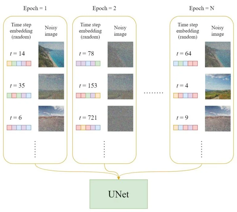 Diffusion Process: The diffusion model, typically a U-Net architecture, takes the noisy latent tensor and the text embedding as inputs. It iteratively denoises the latent tensor over a series of time steps, guided by the text embedding to ensure that the generated image aligns with the input prompt.