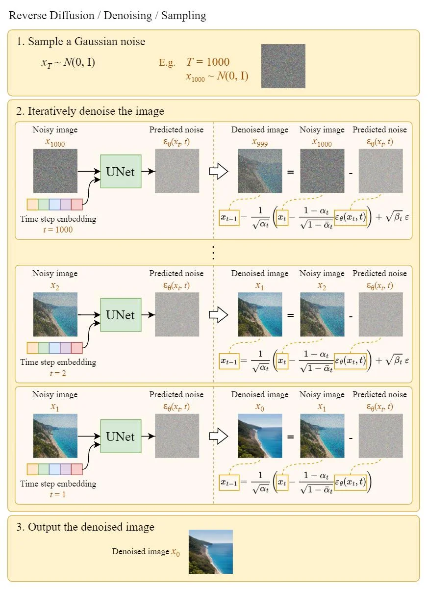 Once the U-Net is trained, the reverse diffusion process can be used to generate new images from random noise. The generation process involves the following steps: