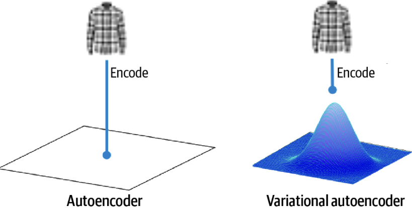 Figure: Comparison between a standard Autoencoder and a Variational Autoencoder (VAE). In a standard Autoencoder, the encoder maps input data \( \mathbf{x} \) to a fixed latent representation \( \mathbf{z} \), which is then used by the decoder to reconstruct the input as \( \mathbf{\hat{x}} \). In contrast, a VAE encodes the input data into a distribution over the latent space, typically modeled as a Gaussian distribution with mean \( \mu \) and standard deviation \( \sigma \). During training, the VAE samples from this distribution to obtain \( \mathbf{z} \), which is then used by the decoder to reconstruct the input. This probabilistic approach allows VAEs to generate new samples by sampling from the latent space, making them powerful generative models. Dataset: Fashion-MNIST. Source: 3.