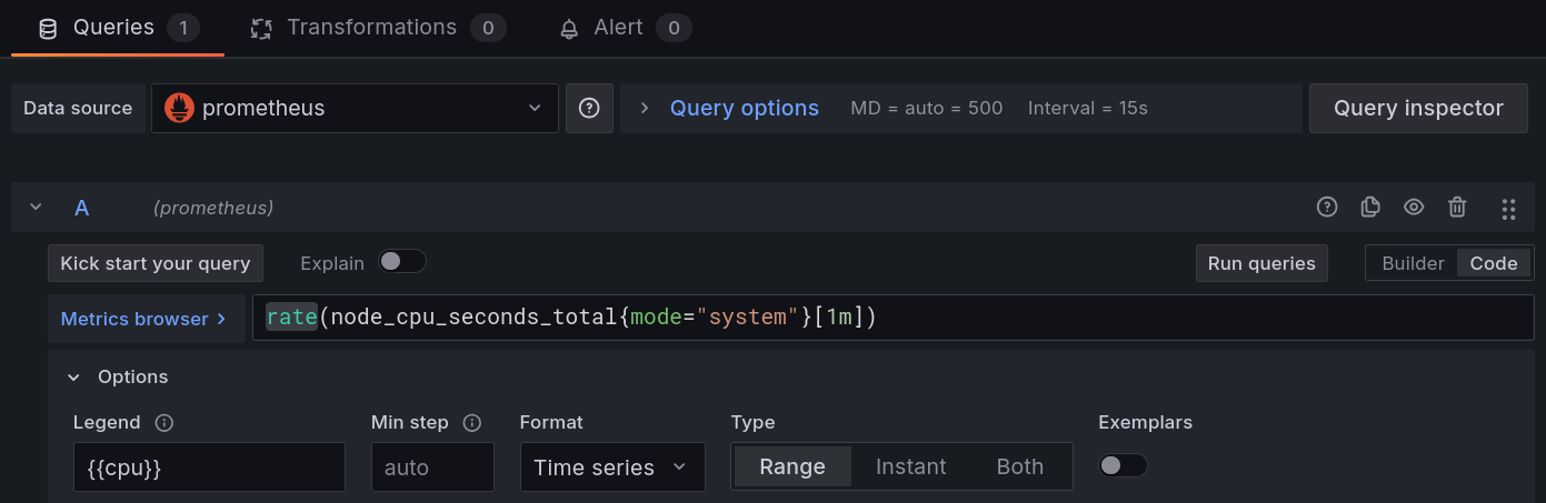 Vamos criar um painel para visualizar o uso de CPU do sistema, usando a mesma consulta PromQL da aula anterior.
