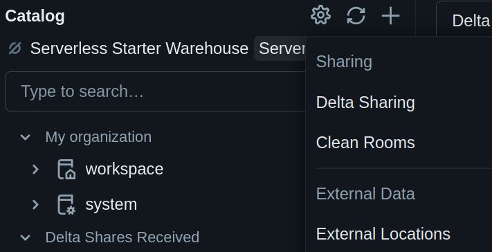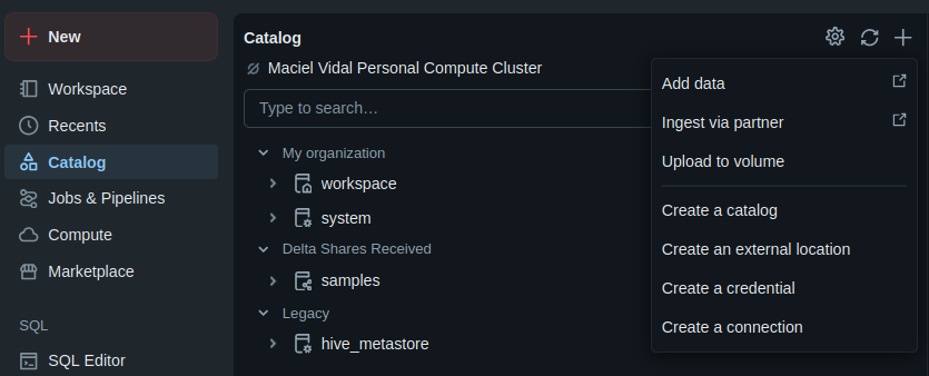Para ver todas as External locations, clique em Catalog no menu lateral esquerdo.