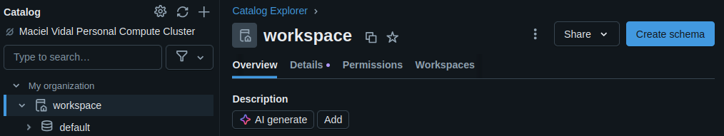 Seu acesso ao workspace está como Admin. Vamos configurar as permissões do Schema para que outros usuários possam acessá-lo.