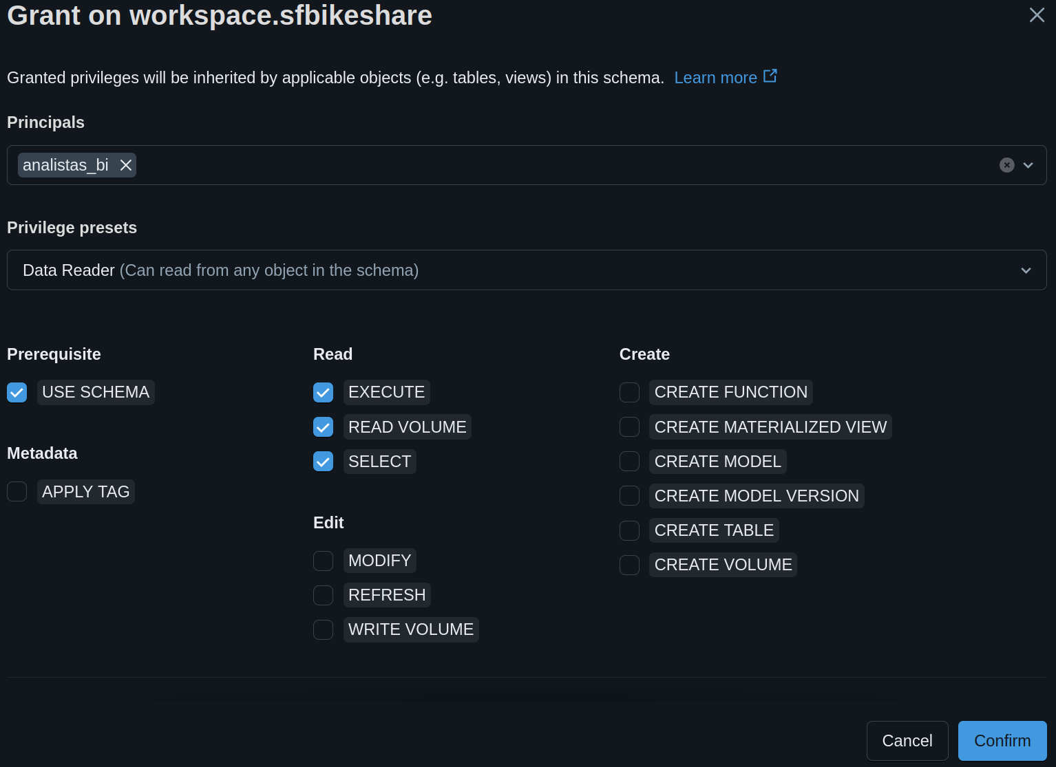 tem permissão de Data reader no Schema sfbikeshare