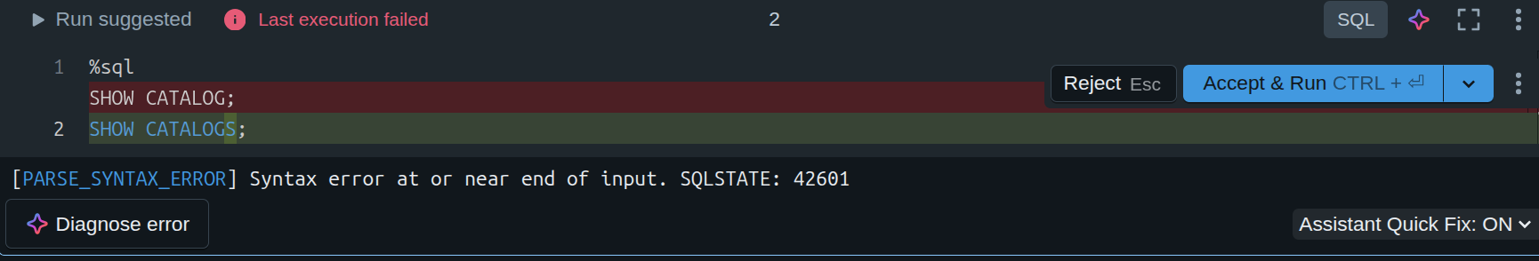 Se você clicar em Diagnose, o Databricks abre um chat com seu assistente de IA para ajudar a resolver o problema.