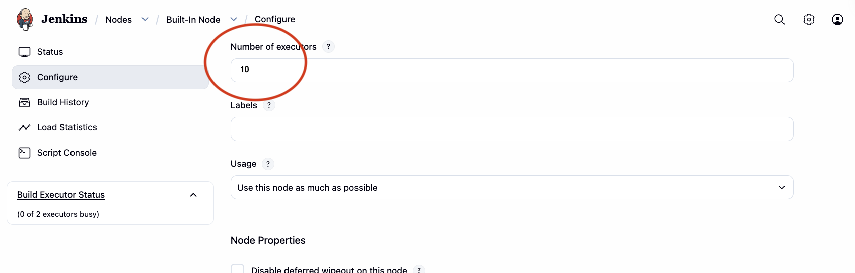 Manage Jenkins → Nodes → Built-In Node → Configure → Number of executors → 10