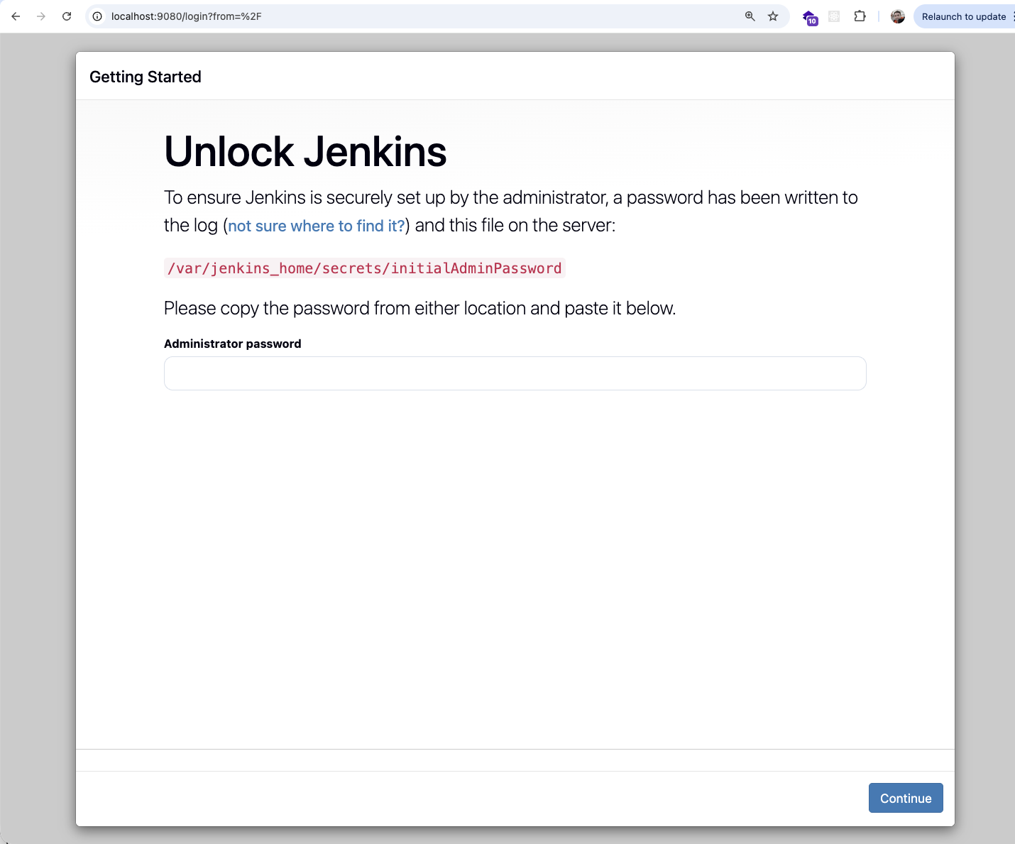 On first start, Jenkins generates a random initial admin password to prevent unauthorised access4. Open the UI and enter it when prompted: